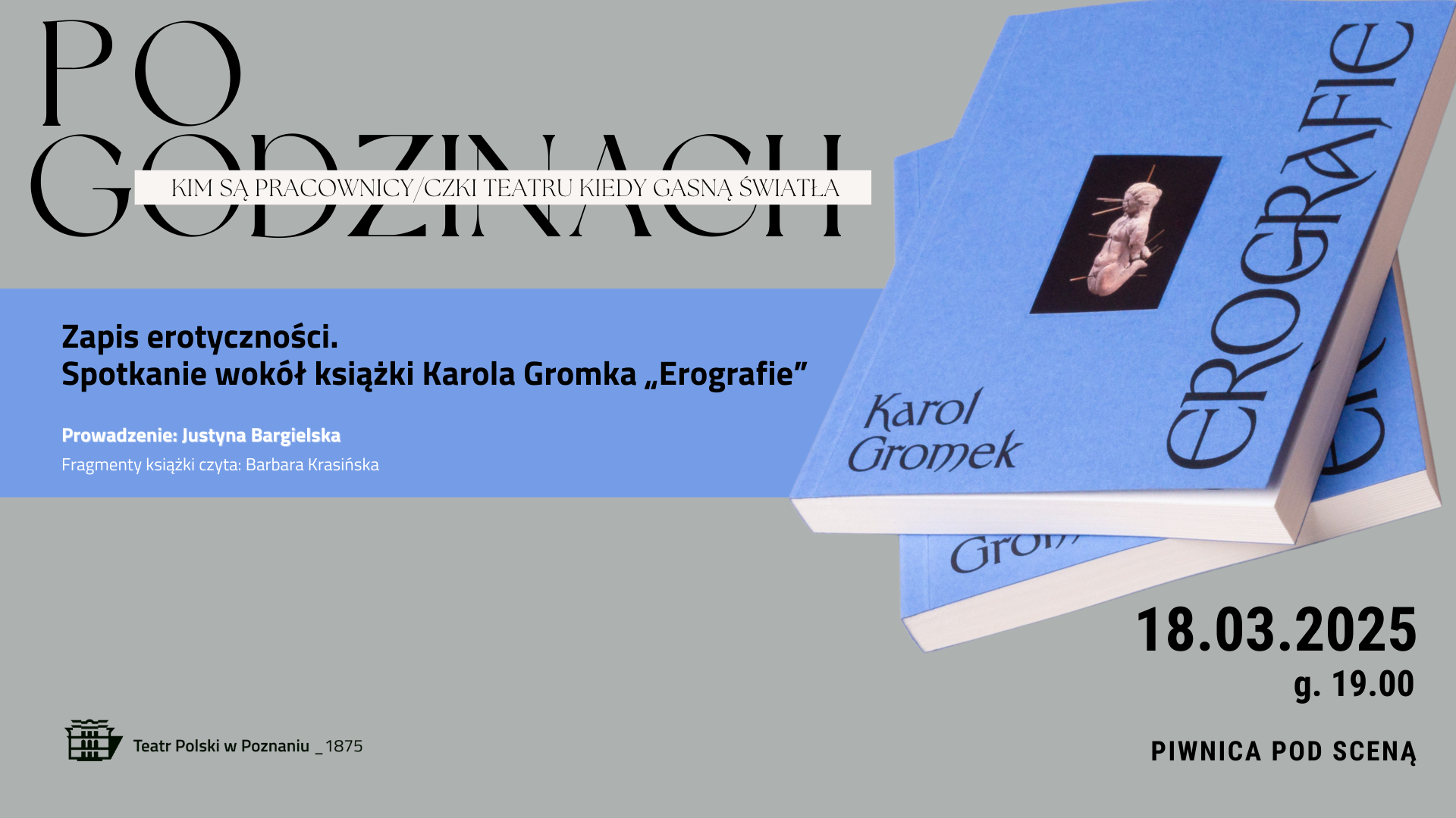 Oprócz pracy inspicjenta Karol Gromek jest doktorantem w Szkole Doktorskiej Nauk Humanistycznych Uniwersytetu im. Adama Mickiewicza i przygotowuje rozprawę o kobiecej mistyce przeżyciowej XIX i XX wieku w Polsce. Jego zainteresowania badawcze dotyczą kategorii ciała i zmysłowości oraz mistyki chrześcijańskiej. Wraz z Marceliną Obarską jest współautorem „Historii dotyku”. Niedawno ukazała się jego kolejna książka „Erografie” i wokół niej odbędzie się spotkanie, którą poprowadzi Justyna Bargielska.